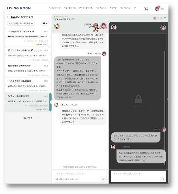 問い合わせチャット形式の問い合わせ窓口を開設できます。用件ごとに対応状況を管理できるため、同時並行で複数の案件に対応することも可能です。チームで話し合いながら対応したり、運営者からメンバーに問い合わせることもでき、さまざまな場面で便利に使えます。 -